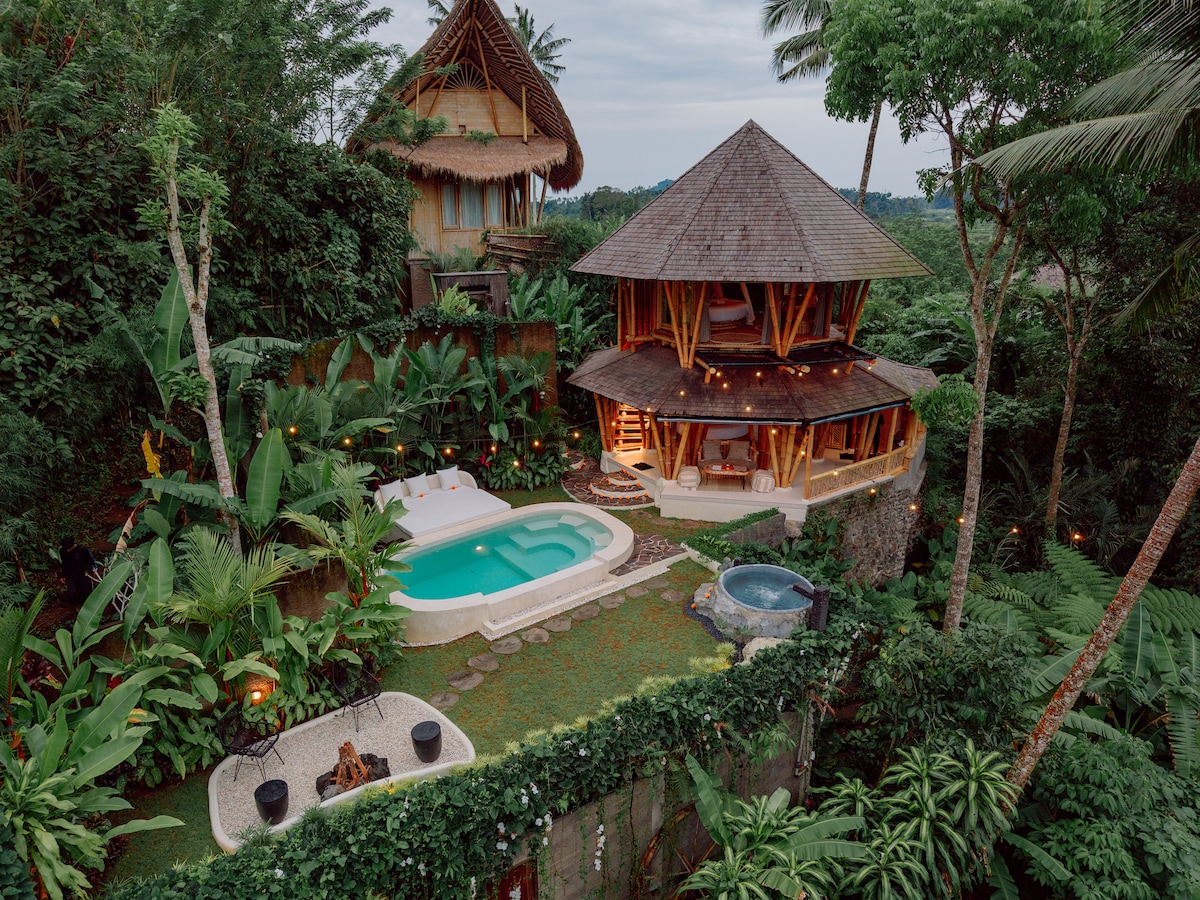Makerti sanctuary houseは、緑豊かな森に囲まれたユニークな2階建ての竹のヴィラで、美しい森とアグン山の景色が楽しめます。この家には、キングサイズのベッドが2台(上階と下階)、専用プール、屋外の石造りバスタブ、居心地の良いファイヤーピットがあります。プライバシーと静けさを重視して設計されており、バリ島で自然に触発された静かな滞在を探しているカップルや小さなファミリーにぴったりです。