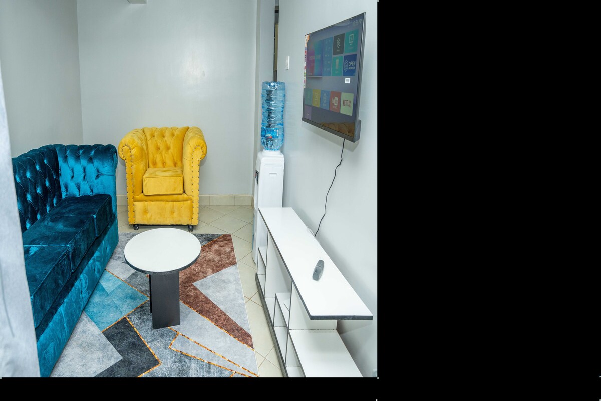 M0 M7 M2 M8 M0 M2 M3 M2 M8 M8 .. This is an executive,modern and very stylish fully furnished 1br apartment with 24/7 security and a smart tv,super fast WiFi, Netflix and a fully fitted kitchen..It is clean,practical and has a beautiful colour scheme with tasteful furnishing..It's a 10mins walk to Naivas supermarket,8mins to Chicken Inn and Pizza Inn,15mins to Quickmart,kfc,V-spot club and 2 mins to Night Fall park..It's a perfect getaway-chic yet cosy..Ideal for rest,work or vacation..