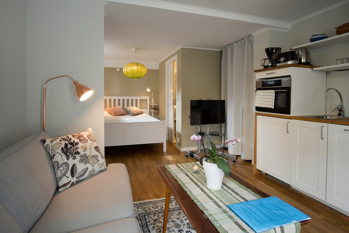 This well-planned 32 SQM-studio in Södermalm is perfect for you as guest or as a couple. The apartment offer free Wi-Fi, a flat-screen TV and a kitchenette. You live just a minute from restaurants, shops and public transport. Situated in a building dating back to the 1650s, the apartment features high ceilings, beautiful stucco details, and, due to the historic construction, somewhat thin walls. It also includes a dining table with chairs and a modern bathroom with a shower.