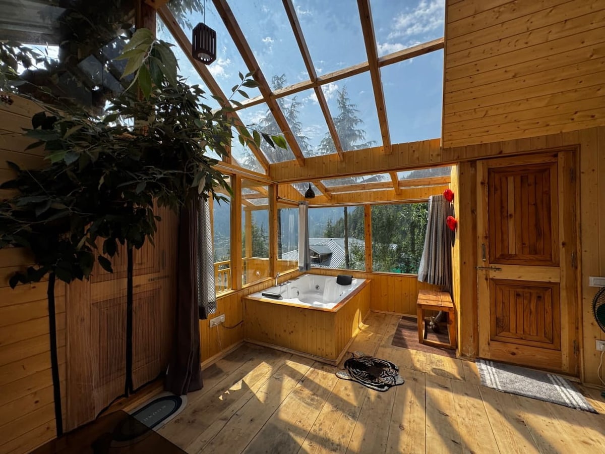 Experience the perfect blend of nature and opulence, perched atop Tandi hill near Jibhi. Delight in a luxurious soak in a hot bubble bath while relishing breathtaking views directly from your bathtub. Nestled away from road and traffic noise, the only sounds you'll encounter are the melodic chirping of birds. With an all-glass cabin, you might even spot a flying squirrel or catch a glimpse of a shooting star in serene night sky. Unwind and enjoy the tranquility of this chic, peaceful retreat.
