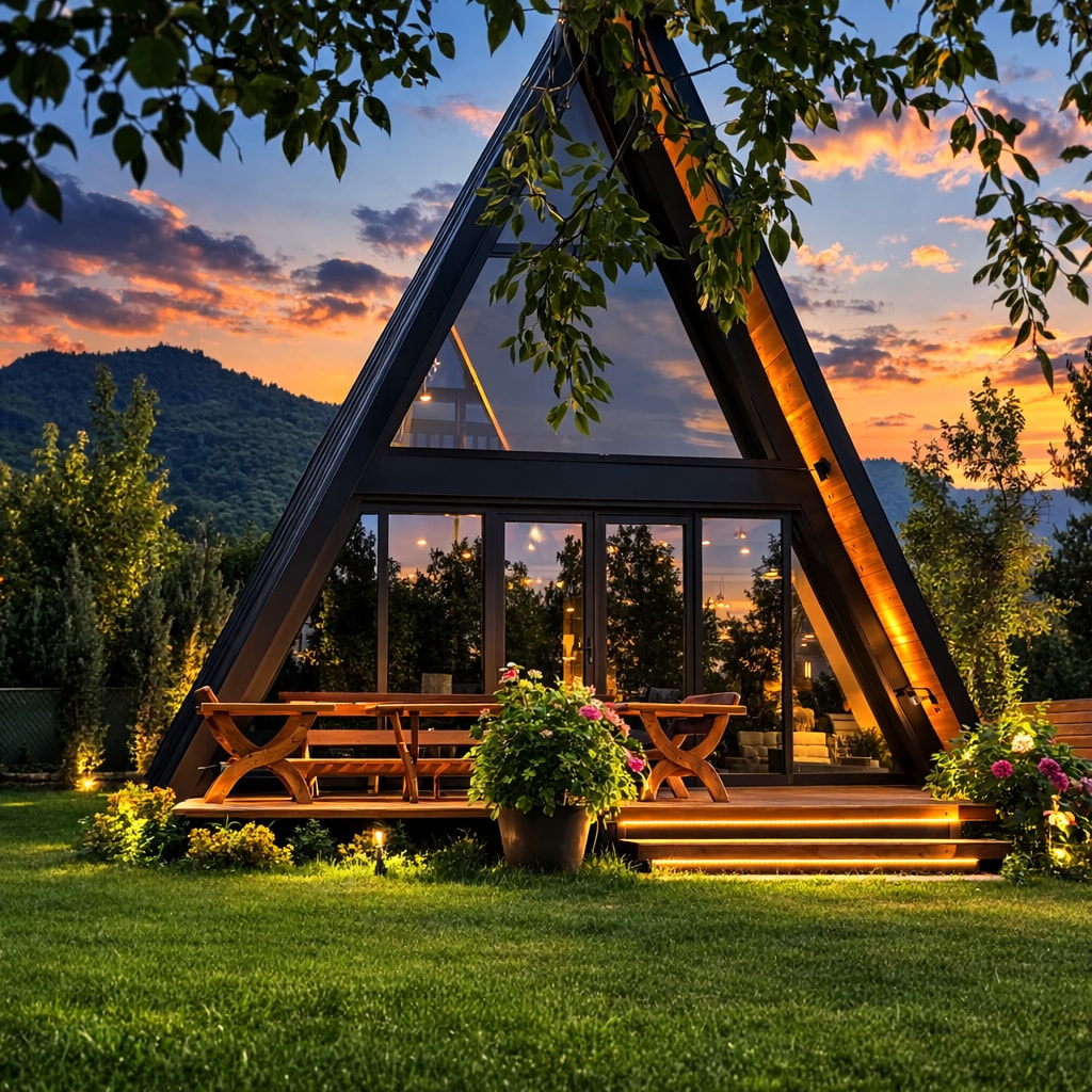 屋外テーブルと椅子があるタイニーハウス