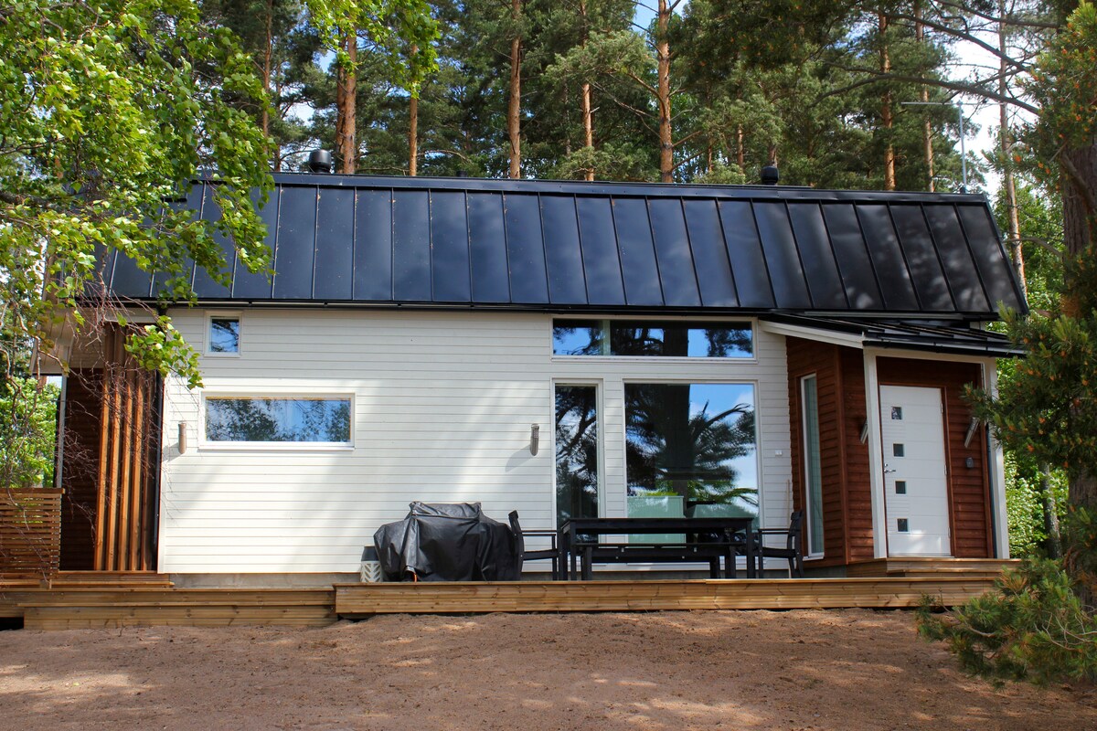 Relax in Villa Ranja, right on the beach! - Private 50m shallow sand beach (part of longer beach, split among the cabins along the beach) - Kitchen-living room, fire place, sofabed (160cm) - Bedroom, double bed (160cm) - Sleeping loft with 4 mattresses - Wood heated SAUNA, 2 showers - Toilet - Big terrace, bbq This is on the countryside, by the sea, on a calm place -however with neighbours around (40 m closest). Best reachable by car Well equipped, modern but some trace of use, built in 2011.