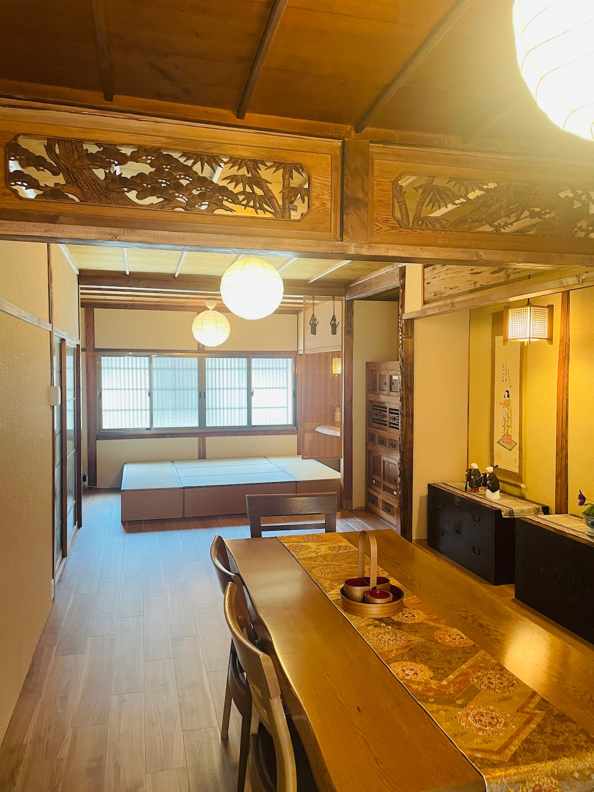 当宿は築150年の伝統的な日本家屋です。 中庭を囲むような形で2つの寝室とリビングルーム、別棟にカフェ、遊技場(卓球台、全自動雀卓等)も併設しています。 近鉄名張駅より徒歩約8分。名張市の旧市街地にあり、今もなお古い街並みが残る地域にあります。 ※当宿は一日一組のみの受け入れとさせていただいております。もちろんお一人様でもご利用頂けます。 ※簡易宿所営業許可取得済み =空調につきまして= 寝室とリビングに換気機能付きのエアコンと空気清浄機、冬場は石油ファンヒーターを設置しております。 古い家屋のため廊下、トイレ等冬季は寒さを感じるかもしれません。ご了承頂ければ幸いです。 無料駐車場:10台 近所にイオン(徒歩3分)がありますのでお買いものにも便利です。