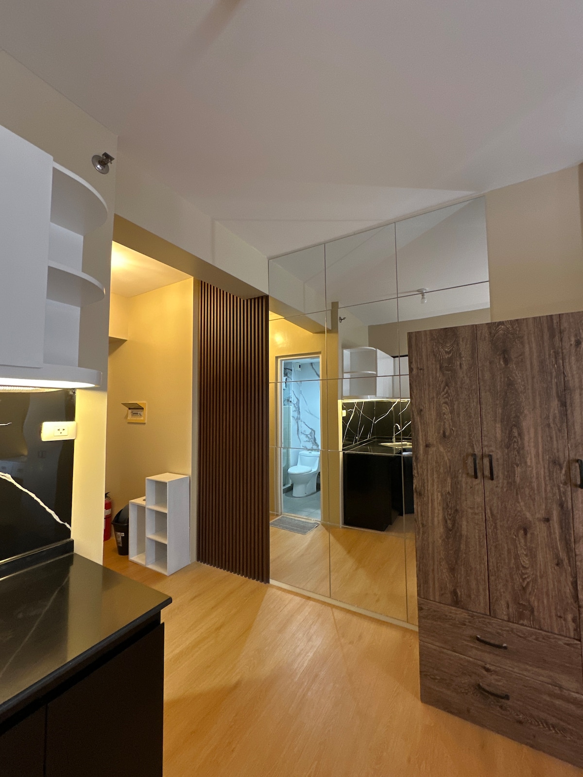 自宅のような快適な宿泊施設でリラックスしましょう!このユニットには、Netflix、Disney +、Prime Videoが視聴できる65インチのスマートテレビが備わっています。キッチンには、IHクッカー、ウォーターディスペンサー、炊飯器が完備されています。強力な給水とヒーターで、爽やかなシャワーをお楽しみください。広々とした寝室にはクイーンサイズのベッドと十分な収納スペースがあります。細部まで快適で静かな滞在を実現すべく作り込まれています。