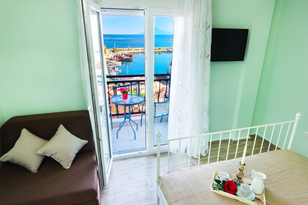 -アパート、海の目の前の2階、タソス島、アトス島、山の眺め。全面改装済み。 - プラッツ・ラプサニ(Plazz Rapsani)から100 mの場所でお風呂を楽しめます。 - 寝室2室、海の目の前のバルコニー3つ、リビングルーム、キッチン、バスルーム - ファリロ公園から150 mの中心部にある、恵まれたロケーション。 -周辺には市場、港、カフェ、バーがあります。 エアコン3台 テレビ50インチフルHD ラジエーター 洗濯機、食器洗い機 電気調理器 電子レンジ コーヒーメーカー トースター 超高速ファイバー300 MbpsのWi-Fi