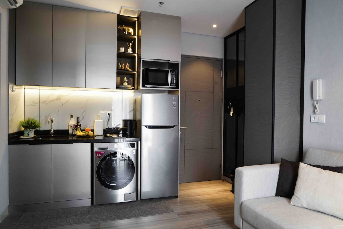 ジャカルタの中心部にあるエレガントな24平方メートルのスタジオで、スタイルと利便性を兼ね備えています。キッチン、高速Wi-Fi、空気清浄機、43インチスマートテレビ、サウンドシステム、Netflixが含まれます。非接触式アクセス、プール、ジャグジー、ジム、バスケットボールなどのアメニティを備え、さまざまなタイプの滞在に最適です。 今では、逆浸透ディスペンサーと食品廃棄物処理機を備えています。 写真には、ガスコンロが写っていますが、火災の危険性に関するアパートのガイドラインに従って、IHクッカーに交換されました。