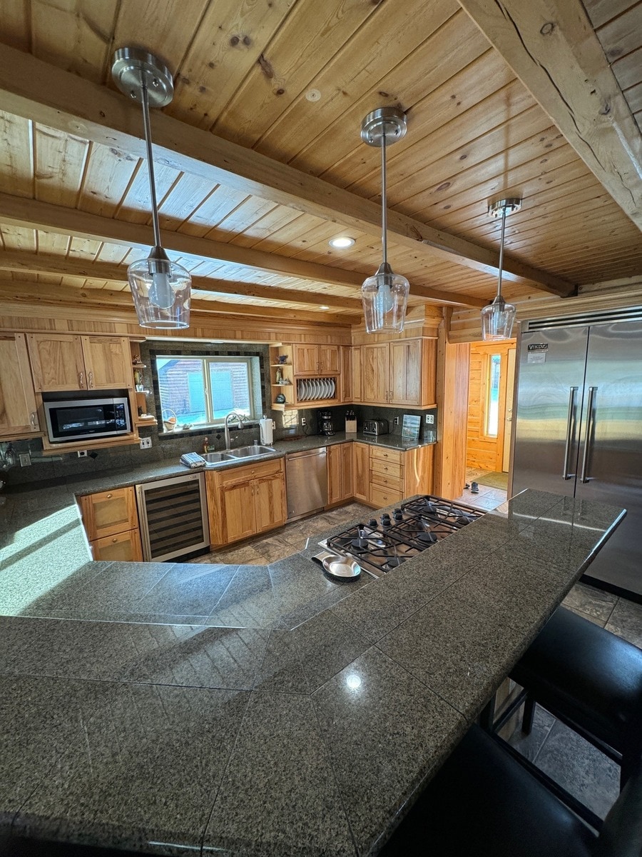 この素晴らしいログハウスには、キングサイズベッドとロフトに専用バスルームを備えた豪華なマスターベッドルームがあります。下の階には、クイーンベッド3台と洗濯機と乾燥機を備えた便利なハーフバスルームがあります。メインフロアには、設備の整ったキッチン、バスルーム、居心地の良いリビングルームがあります。キッチンバーの周りにある6つのバースツールと6人用のダイニングテーブルは、最大12人のゲストをもてなすのに十分なスペースを提供します。
