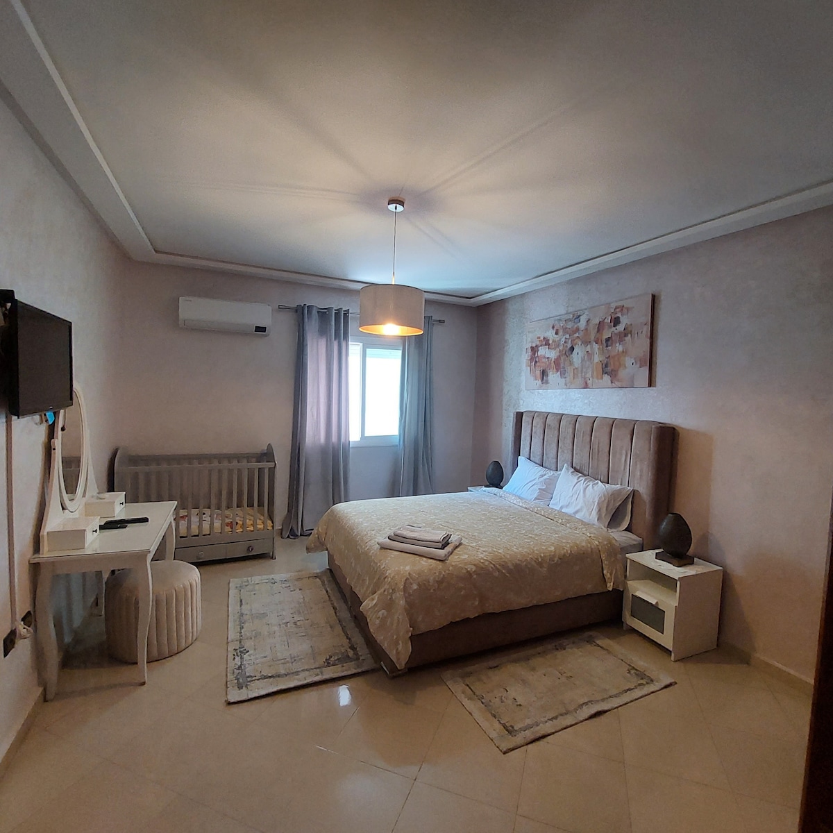 Magnifique appartement spacieux et entier situé au centre-ville de kenitra avec une belle vue sur le lac sebou, proche de toutes commodités ( restaurants/supermarchés). Composé d'un grand salon avec canapé et salle à manger, TV et climatiseur ainsi que wifi disponible. Vous y retrouverez aussi 2 chambres, une salle de bain et une cuisine bien équipée sans oublier un coin café avec une machine à café nespresso. C'est un appartement paisible avec un bon voisinage dans un cartier calme et sécurisé.