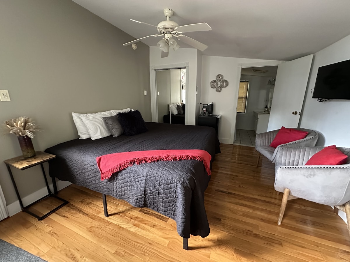 美しいフィンガーレイクスの中心部にある自給自足型のアパートです。 キューカ大学、公園、レストラン、博物館、トレイル、ワイナリー、カヤック/自転車レンタルに近いです。 ボート/トレーラー用のスペース。 ロックボックス付きのセルフチェックイン とても清潔で、下のアパートには専用玄関があります。 快適なキングサイズベッドが備わった大きな寝室があり、リクエストに応じてツインベッド2台に変換できます。 床にツインサイズのマットレスがあり、1泊につき最大2名のお子様(それぞれ15ドル)または大人1名(40ドル)まで宿泊可能です。 シャワー付きの専用バスルーム。