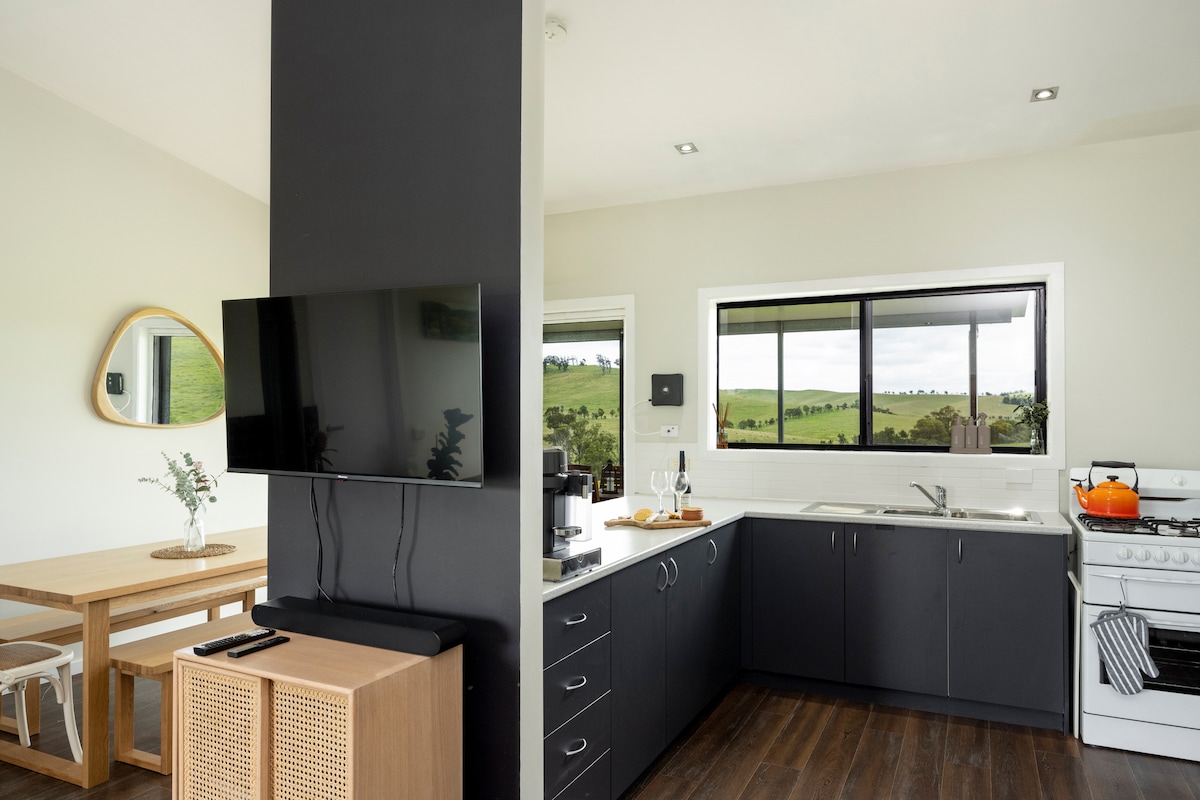 環境に優しく、超快適な空間で、どこからでも素晴らしい景色が楽しめます。テーブルランドの清潔な空気と、田舎の生活の絶対的な平和と静かさを楽しむことができます。 ベランダ、石壁のガーデンデンベッド、谷の景色が見える豪華なバスルーム、深いレザーラウンジ、ゴージャスな農地、美しいニューイングランドの静かで平和な環境に囲まれて、Wi-Fiや65インチテレビなどは必要ないかもしれません。でも、とにかくあります! 家族やカップル、静かな旅行に最適です。