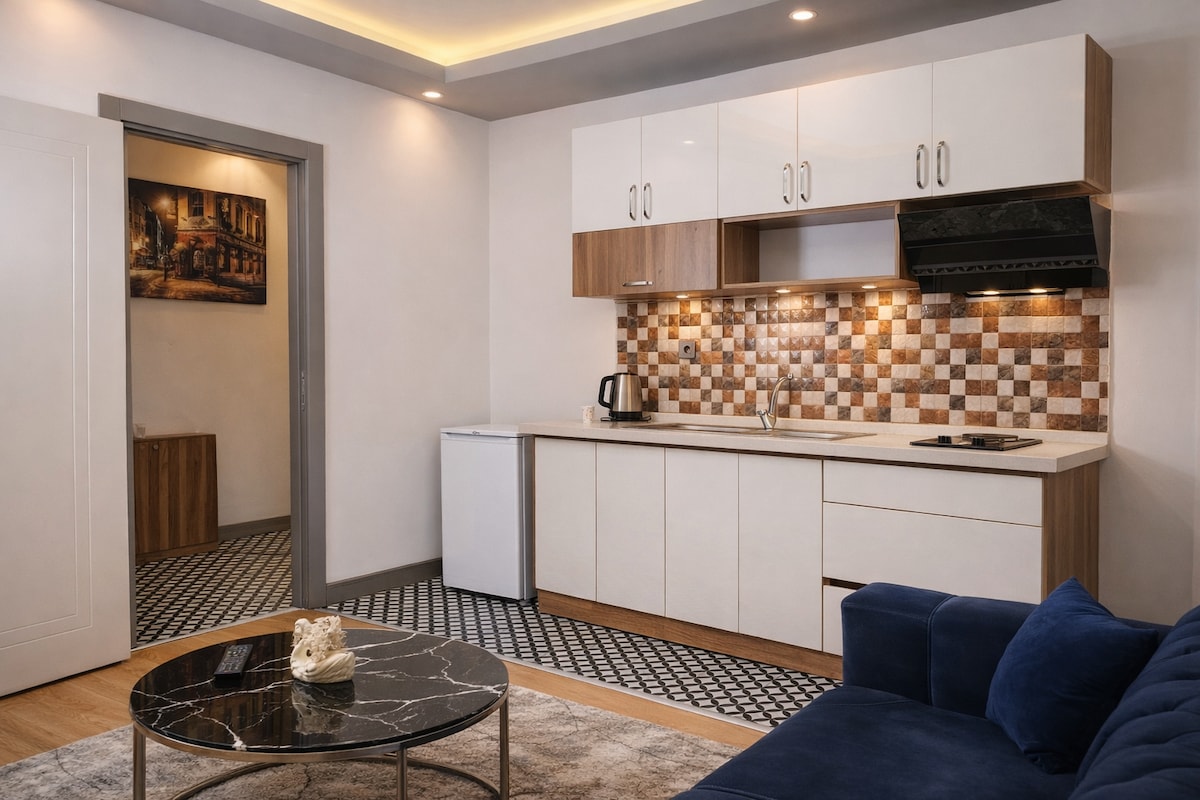 🌆 Deluxe Room ✨ Balkonlu Modern Oda ✨ 🛋️ 1 Salon + 🛏️ 1 Yatak Odası + 🌿 1 Balkon Şık detaylara sahip bu modern oda, keyifli bir konaklama sunar. Amerikan mutfak, minibar, salon ve balkon rahatlığını bir arada yaşarsınız. Rezervasyonunuzda, fotoğraflarda yer alan daire düzenlerinden biri sağlanır. 🚭 Sadece balkonda sigara içilebilir! 📍 Merkezî konumuyla ulaşım kolaylığı 🧼 Temizlik ve konfor önceliğimiz 🔑 Özenle dekore edilmiş, hazır yaşam alanı