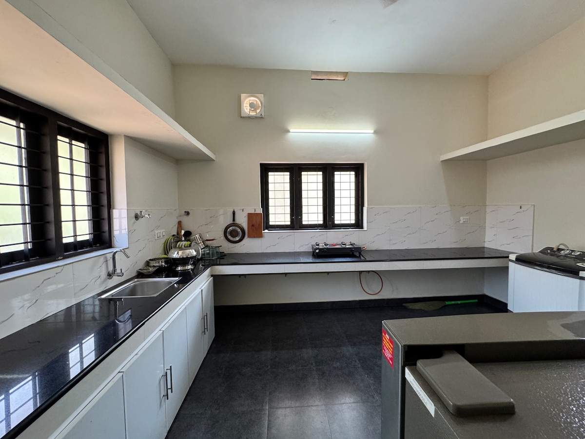 Independent entire Villa, Centrally located, quiet, and peaceful, this retreat is perfect for exploring the city’s vibrant dining, shopping, beaches, and entertainment. A 10-15 min drive to the railway station, South Beach, Lulu Mall, MIMS Hospital, and popular spots like Paragon Restaurant, Focus Mall, Tagore Hall, Maanachira square, and Crown Theater. Clean, tidy, and fresh, with support staff on hand. Base price covers 4 guests; additional guests incur a nominal charge.