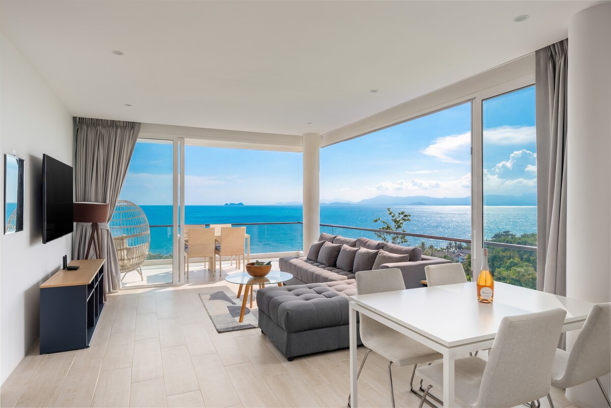 Located by the beautiful & calm Ban Kai beach (2 minutes walk) in Koh Phangan, a spacious 100㎡, fully furnished, modern & stylish Sea View Apartment. • 2 A/C Bedrooms: very comfortable King Size Beds, wardrobe & bathroom attached to each. • 40㎡ A/C Living Room & Dining space, fully equipped kitchen with coffee machine, complementary coffee, tea & drinking water. • Sea View from every room • 30㎡ terrace facing the sunset with amazing Panoramic Sea View. ★ Weekly & Monthly Discounts ★
