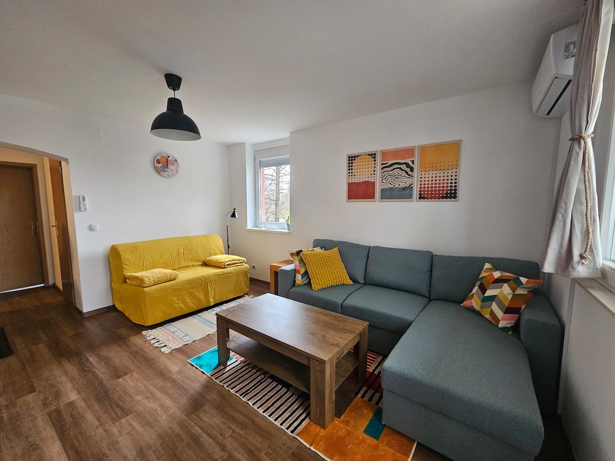 このおしゃれな宿泊先で、家族みんなで楽しんでください。 アパートには、ダブルベッド1台、シングルベッド2台とソファ1台、設備の整ったキッチン、喫煙エリア、テレビ、ワイヤレスインターネット、洗濯機/乾燥機付きバスルームが含まれています。 ご要望に応じて、ベビーベッドを2台手配いたします。 アパートは市内中心部にあります。