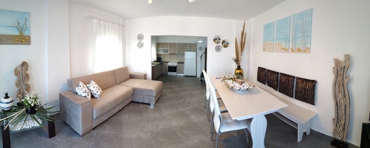"Cozy home with a spacious private yard and breathtaking sea view. Perfect for up to 4 guests, featuring a fully equipped kitchen and comfortable living space. Enjoy peaceful mornings on the terrace, just minutes from beaches and local cafes. Ideal for couples, friends, or families seeking a relaxing getaway in Samos."