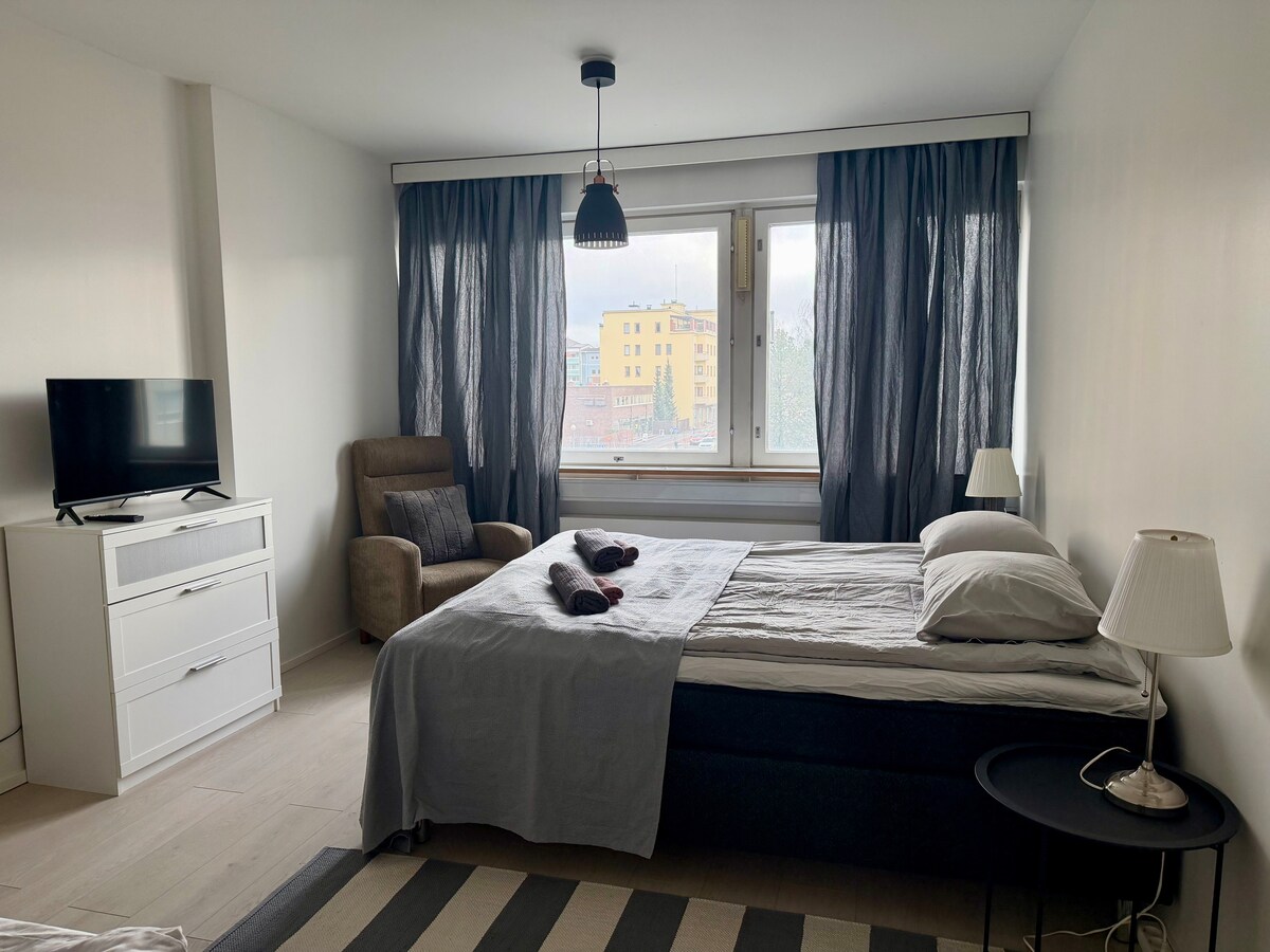 レーナラ地区にある明るく、静かで、モダンでスタイリッシュな小さなアパート。アパートには、幅140cmのダブルベッドと、幅80cmのデイベッドがあり、1〜2台の追加ベッドを作ることができます。夏の暑さには、アパートの冷却装置で涼しく過ごせます。屋内プール、アイスリンク、ハイブリッドアリーナ、イベントパークがすぐ近く(0.6km)にあります。海の公園、サンタハの野外運動エリア、中央病院、劇場、スネルマン音楽センター、駅まで徒歩約15分(1.2-1.5km)。