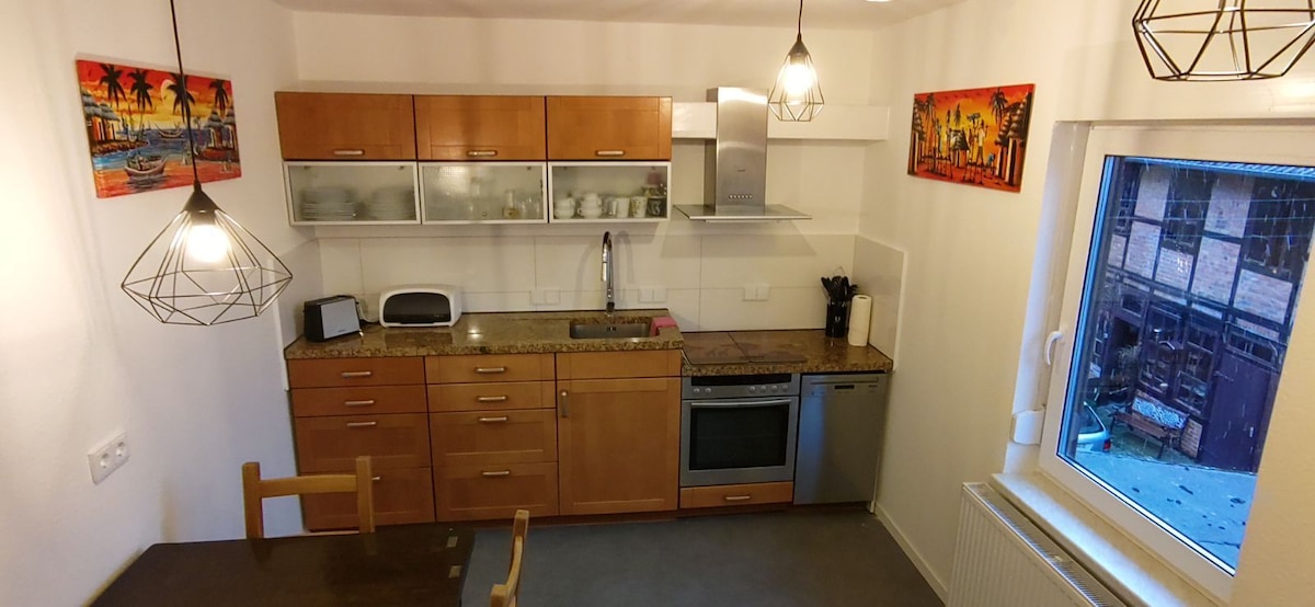 Die Zwei-Zimmer Wohnung befindet sich in einem traditionellen Fachwerkhaus etwa 10-Autofahrminuten von der Wolfsburger Innenstadt entfernt. Sie befindet sich im ersten Stock und wird über eine Treppe erreicht. Das Badezimmer wurde im Jahr 2020 modernisiert. Kompakte Fahrzeuge können auf dem Hof und größere an der Straße etwas 20-30 Meter weiter abgestellt werden. Die Waschmaschine & der Trockner im Waschraum können gegen eine Gebühr von 2 € genutzt werden.