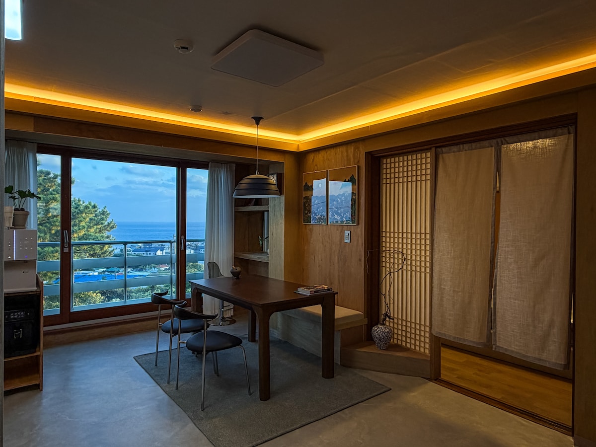 こんにちは。 西帰浦中心の絶壁の上に位置しており永久眺望とともに完璧なオーシャンビューを持っている空間です。 私たちの空間はプライベートな小型の一軒家型空間であり、他の旅行客と分離されており、周辺の騒音なしに宿泊客が利用することができます。 客室は19坪で、寝室とリビングなどが区分されており、客室を含めて プール、朝食が楽しめるカフェ、屋外庭園のすべての空間で海を眺めることができます。 共用で使用するプールと最高の海の眺めを誇る素敵な空間で朝食を提供し、済州旅行で余裕と快適さをお届けします。 インフィニティプールで構成されたプールは、5月から10月の間に運営しており、その他バーベキュー施設などすべての施設を一年中お楽しみいただけます。 無料朝食が楽しめるカフェでは、最も済州らしい海と島を同時に見ることができる素敵な空間です。 カフェと屋上庭園から虎島を涼しく眺めながら、済州島の美しい夕焼けを作っていくことができる思い出を作ってください。