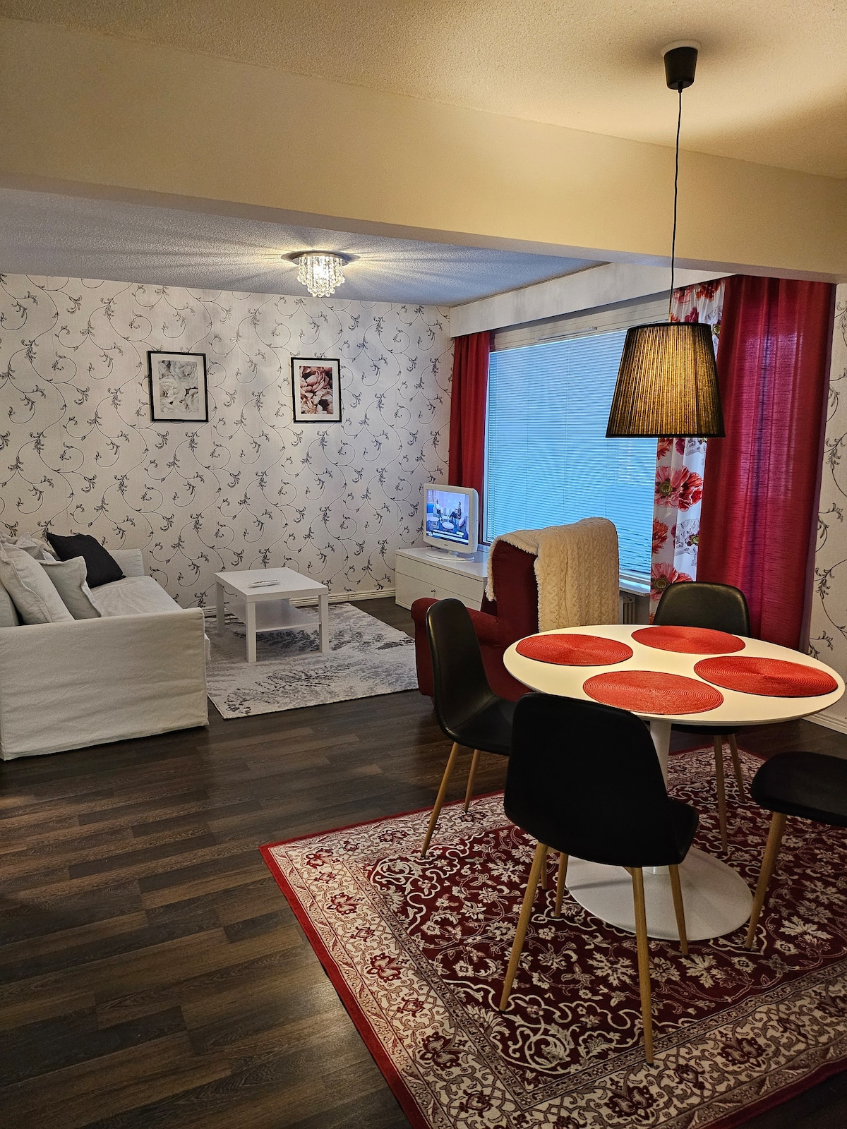 Beautiful 35m² studio in the center of Kouvola. This is the perfect place if you need a relaxing break. Enjoy a bubble bath in the pink bathroom and sleep well in a good bed. The apartment building is quiet and tidy. There is a market (Sale) next door, where it is easy to pick up breakfast items (open every day from 7am to 11pm). Free parking in the yard. The nearest electric car charging point is in the yard of the Sale market.