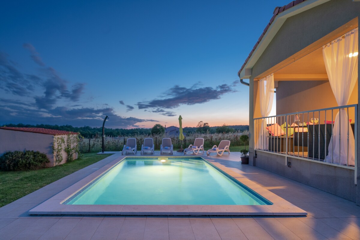 新築のヴィラグレースは、ラビンから4 kmのイストリアの村スヴェティ・バルトゥルにあり、4名様を収容できます。 フェンスで囲まれた専用庭園には、プール(28平方メートル)、サンラウンジャー、パラソル、屋根付きテラスがあります。