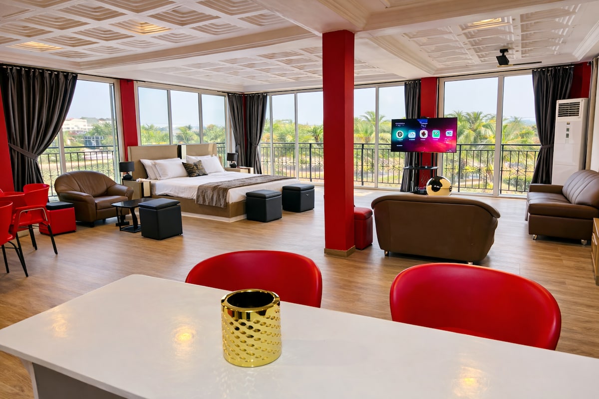 アクラでの素晴らしい体験はここから始まります。今すぐ予約して、ゲストが「自宅のように快適な宿泊先はこれしかない」と言う理由をご確認ください。 屋上プールとジムをご利用いただけます。 Airport Residentialにあるこのスタイリッシュなユニットは、ホテル並みの快適さを提供します。クイーンベッド、鮮やかな黄色のソファ、スマートテレビ、高速Wi-Fi、涼しいエアコン、簡易キッチン、静かなバルコニーをお楽しみください。エアポートシティ、レストラン、モール、カフェ、ローマンリッジまで安全に歩いて行けます。空港まで車で5 ~10分です。出張旅行者、カップル、一人旅、週末のお出かけに最適です。