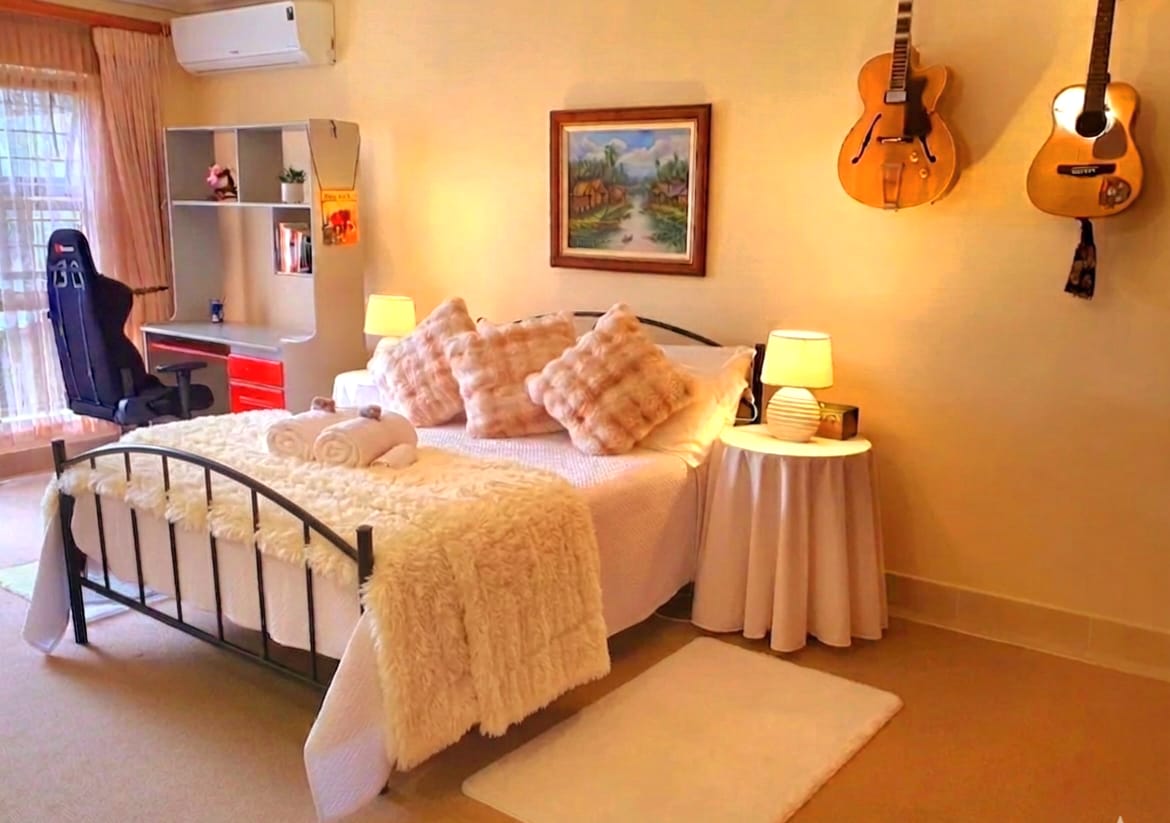 閑静な袋小路にあり、安全です。 ダイニングエリアと設備の整ったガスコンロ付きキッチン。 スマートテレビ、Showmax/Netflix/YTを備えた居心地の良いラウンジ。 無料の高速Wi-Fi(上限なし)。 2階には寝室が3部屋あり、それぞれにデスクがあり、パジャマラウンジにつながっています。 キングベッド、専用フルバスルーム、ジェットバス、バルコニーを備えたメインベッドルーム。 大きなレンガのバーベキュー/ブライと家具付きラパを備えた囲まれたプライベートガーデン。 ゲートから駐車場へアクセス。 洗濯機、回転式の干し綱。 シングルオートガレージ。グループ、ご家族、長期滞在、短期滞在に最適です!