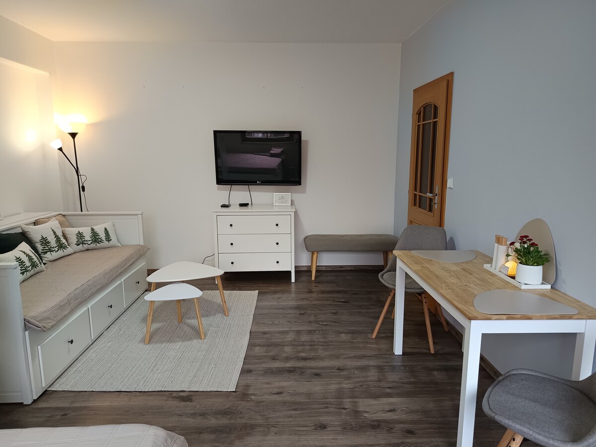 Sunny attic apartment in a quiet part of the city near the center and the forest. The bedroom offers a double bed with a size of 2x2m. There is a sofa in the living room, which can be expanded to a size of 190x150 cm and allows two more people to sleep. In the living room there is a kitchen with stove, sink, refrigerator, dishes. The apartment has wifi and two televisions. The bathroom has a small wooden sauna for max. 2 people. The toilet is separate. You are in the center in 5 minutes on foot.