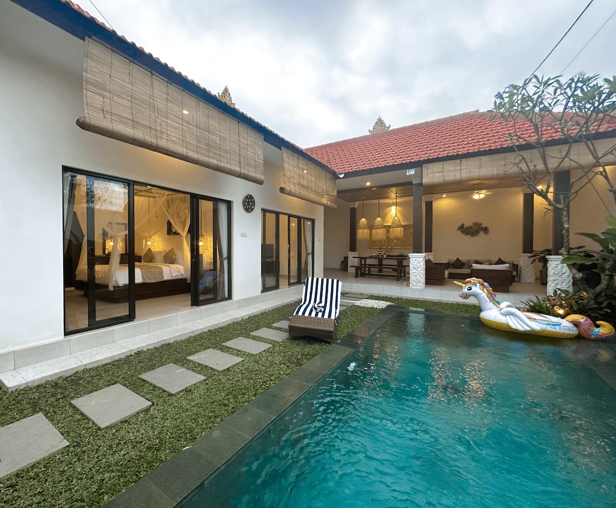 美しくロマンチックな1ベッドルームのヴィラで、専用スイミングプール、フローティング朝食、エアコン、ホームエンターテイメント、リビングダイニングエリア、設備の整ったキッチンが備わっています。セミニャックの中心部に位置し、ショッピングセンター、国際的なレストラン、カフェ、観光スポット、スパ、ナイトライフまで徒歩圏内で、ビーチまで車でわずか7分です。 私たちは、バリ島スミニャックで充実した時間を過ごしたい新婚旅行者やカップルに合わせて、このヴィラをたくさんの愛情を込めて建てました。