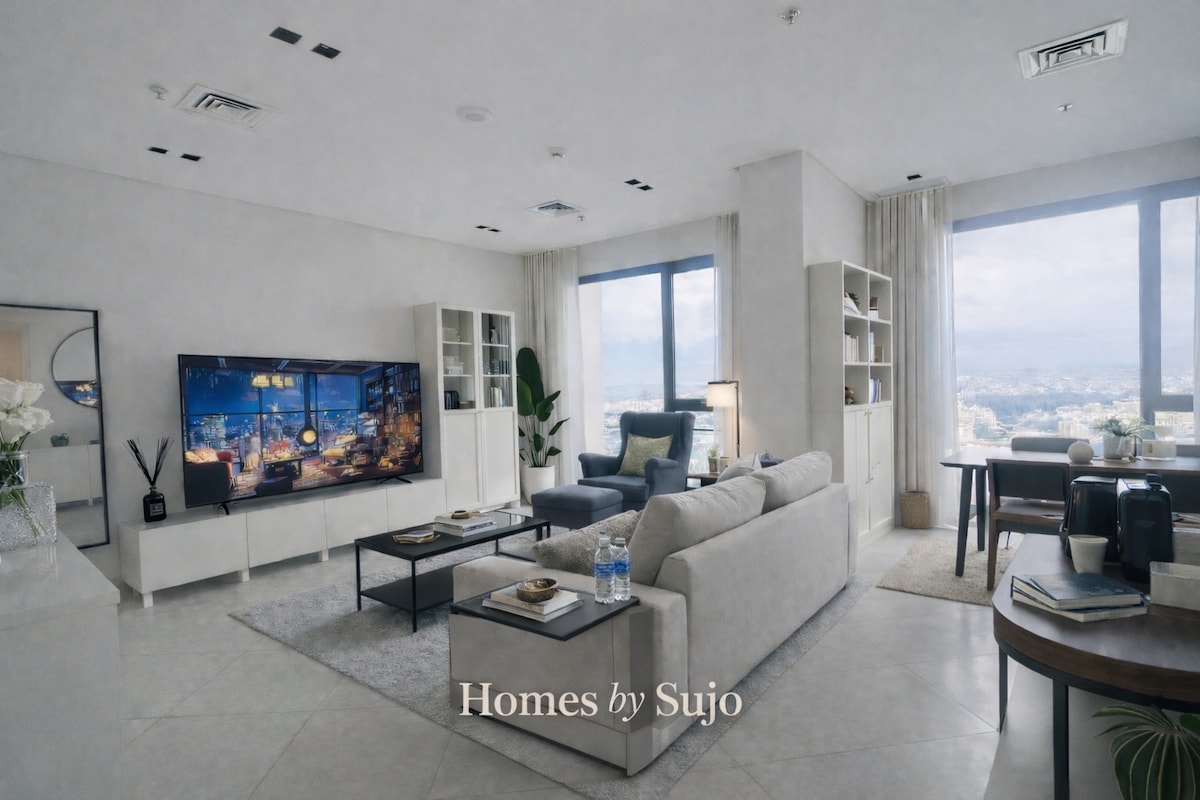 Experience refined modern luxury in this high-rise apartment at the iconic 60–62 Twin Towers, Belajet Roundabout, Salmiya. Located on a high floor, it offers breathtaking panoramic sea views with a dedicated lounge seating area. Enjoy a 98” Samsung TV with Dolby Atmos, Philips automatic espresso machine ,Philips Hue lighting, Dyson air purifier & hair dryer, PS5, and Dr. Vranjes diffusers. Let me host you and make your stay an memorable experience 😊