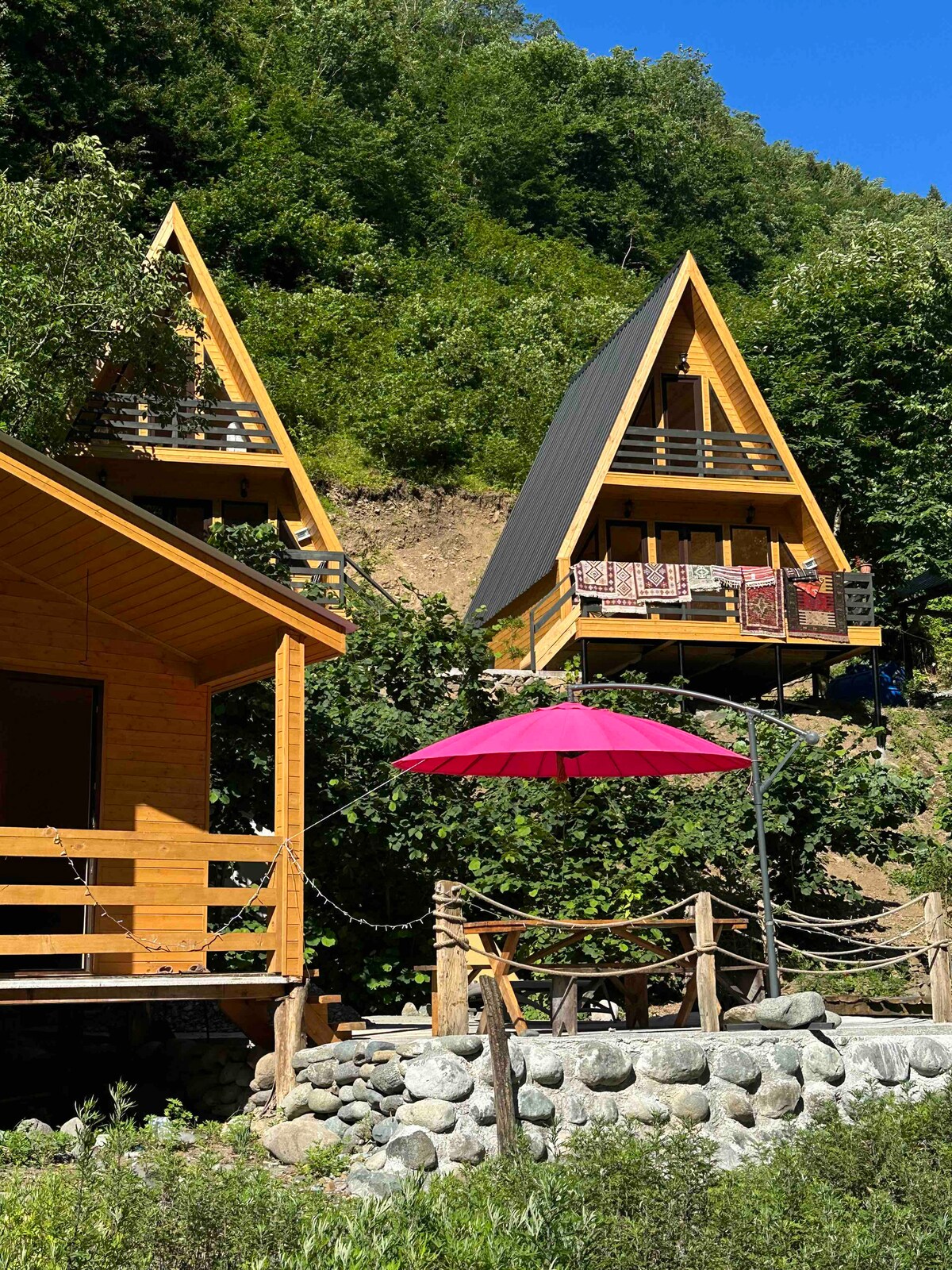 Our modern fully furnished villas are located on the riverbank inside Machakhela National Park. We invite you to enjoy the unique nature and traditional Georgian hospitality. We have small but cozy family cafe where we serve traditional Georgian cuisine. Our gem is a perfectly built firewood steam sauna. Here you can fully relax with traditional bath procedures using eucalyptus brooms and dipping into the cold mountain river (available at an additional cost of 250 GEL for 2 hours).