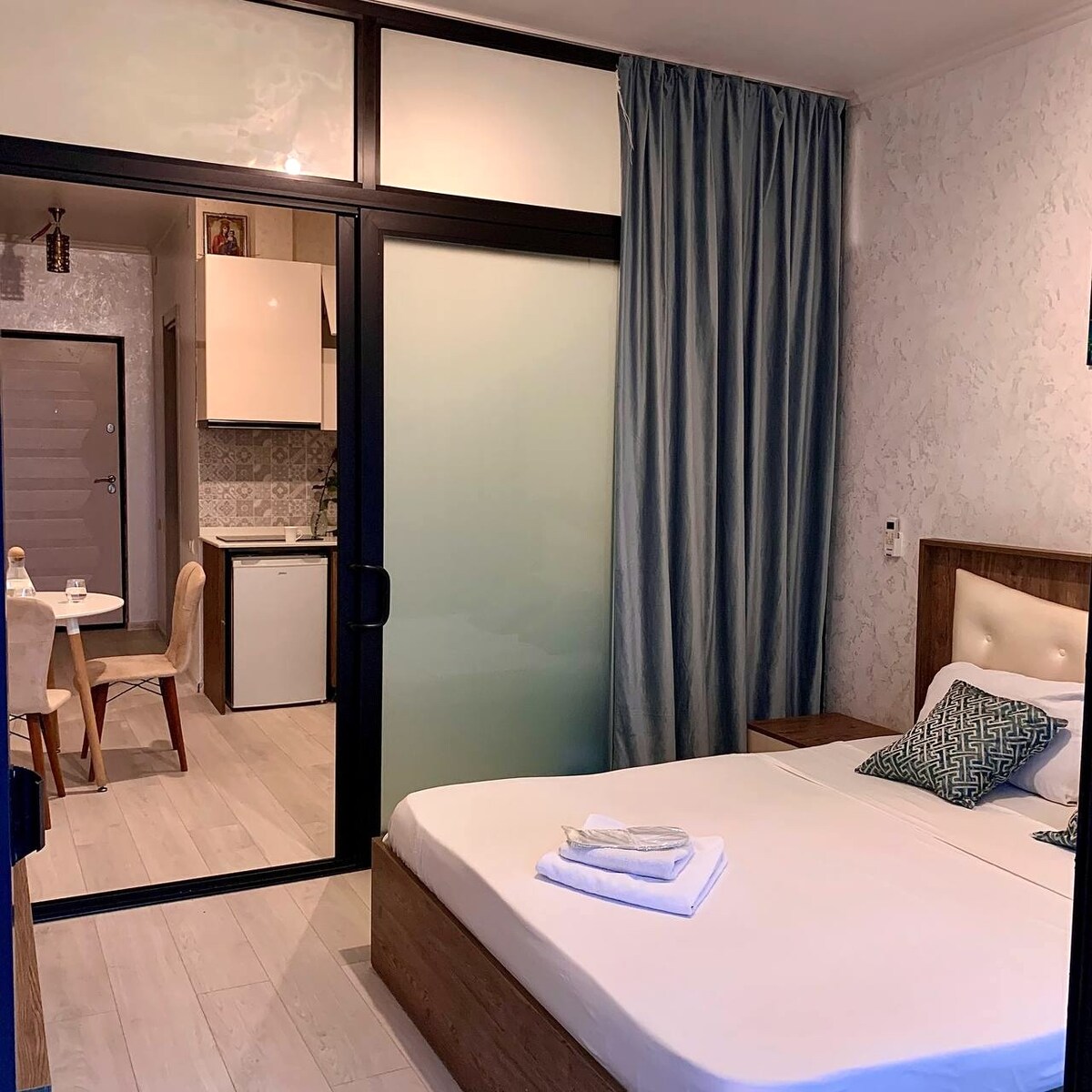 This 50 sq. meter luxury suit apartment is located in center of batumi. In a prestigious building (Courtyard by Marriott). Very close to the sea (100 meter distance) Apartment is on 25th flour with an incredible sea view. It has all necessary equipment for comfortable rest and living for a long term. Kitchen utensils, as well as iron, washing machine, vacuum cleaner etc. Building has inside pool, spa and casino and also high-class restaurant, where breakfast can be served for an additional fee
