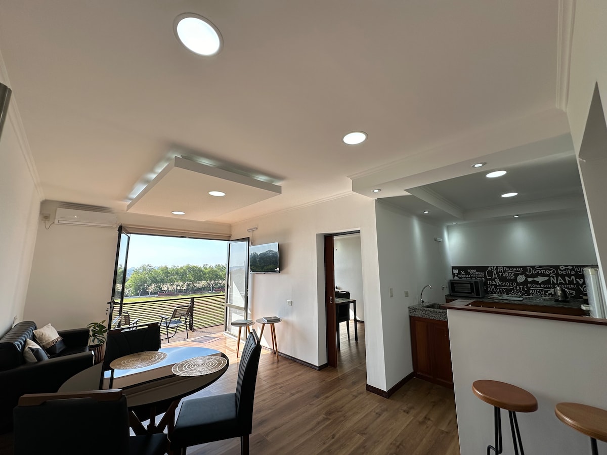 イグアスの中心部にあるこの広く明るいアパートをお楽しみください。寝室2部屋、フルバスルーム2部屋、バルコニー、グリルを備え、1日の散歩の後にリラックスするのに理想的です。キッチンには調理に必要なものがすべて揃っており、バルコニーからは緑の景色を眺めながらリラックスできます。立地は最高です。すべてのものに近く、ご自宅のように安心してお楽しみいただけます。ジャグジー、高速Wi-Fi、ワークスペースもあります。