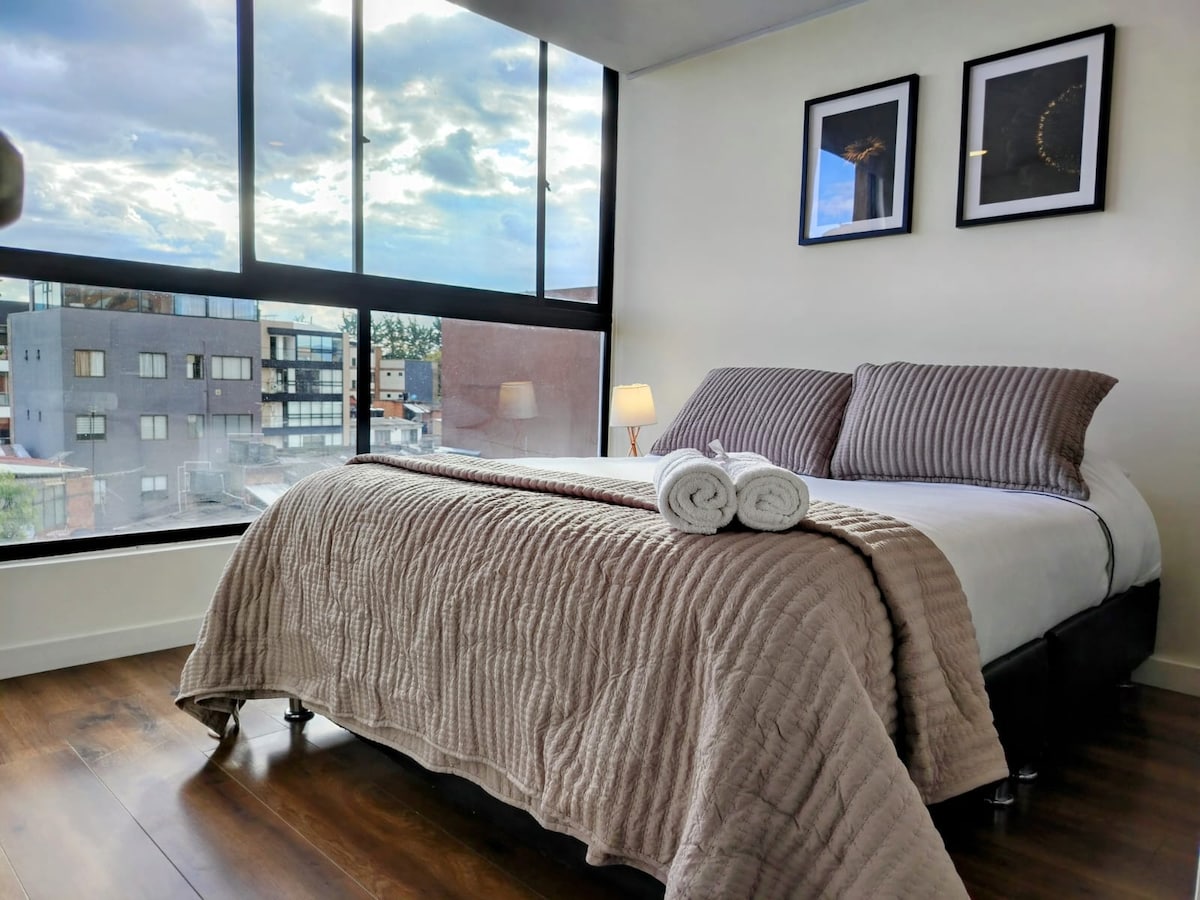 Bright and modern private apartment with a cozy living room, fully equipped kitchen, spacious Queen bedroom and WiFi. Relax in a quiet neighborhood, just minutes from TransMilenio, parks and supermarkets. Numero de Registro Nacional de Turismo No 114067