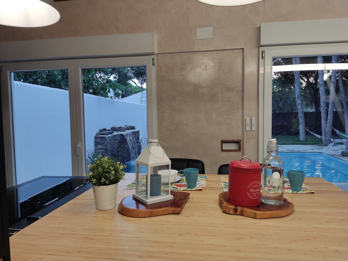 エレガントなデザインの壮大な宿泊施設。500メートルの独立した敷地内に、ダブルベッドの寝室、プールに面した大きな窓のある広々としたリビングルーム、キッチン、バスルーム、2つのダブルベッドのある屋根裏部屋があり、そのうちの1つには夜に星空を見ることができる天窓があります。ホームオートメーション、Alexa、インターネット。滝とスワンネック付きプール。プールとシャワーの隣にある外部バスルーム。クライミングウォール。ピナール・デル・エデンに位置し、ビーチに近い
