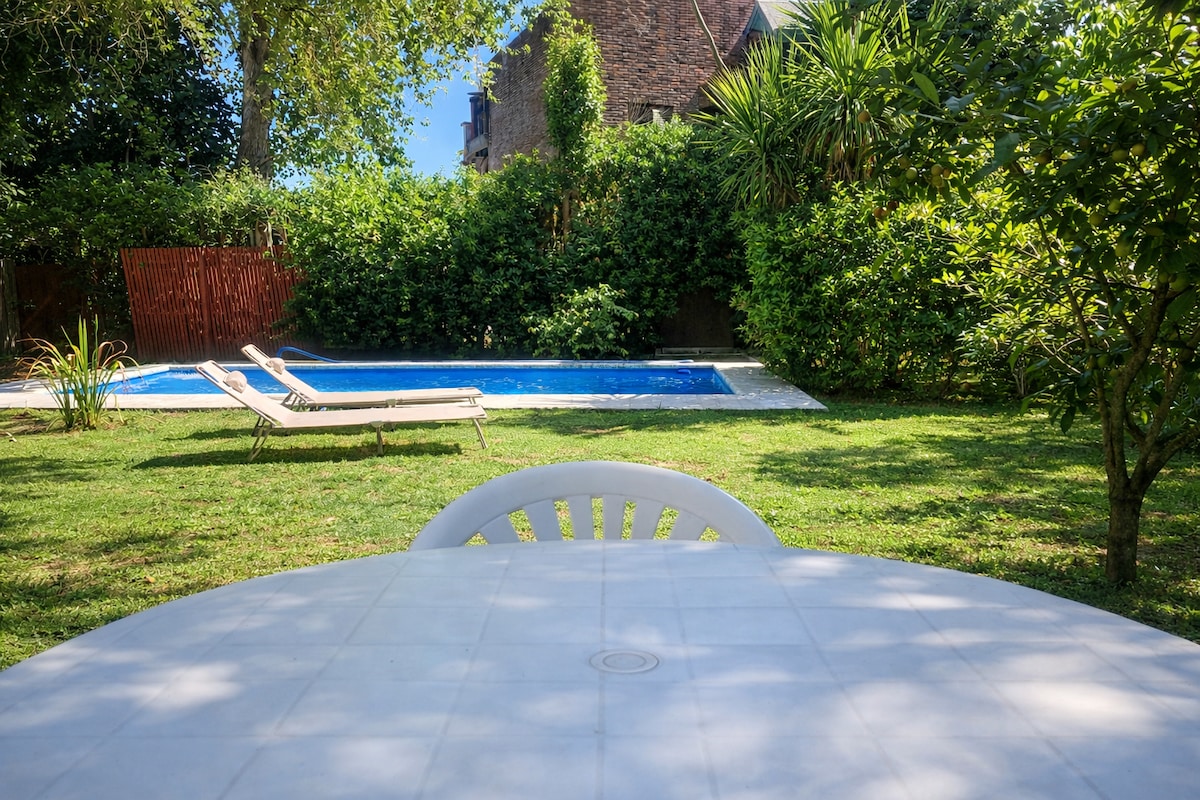 Casa Feng Shui de huéspedes . Muy luminosa. Vestidor, cocina con vajilla completa,Microondas, heladera con frezer,.Baño privado .Caja Fuerte, Vistas al jardin,Piscina con luces Led de uso exclusivo de los huespedes, Parrila y juego de jardin. Wi Fi, Smart TV ,Netflix ,Cable Ropa de cama.