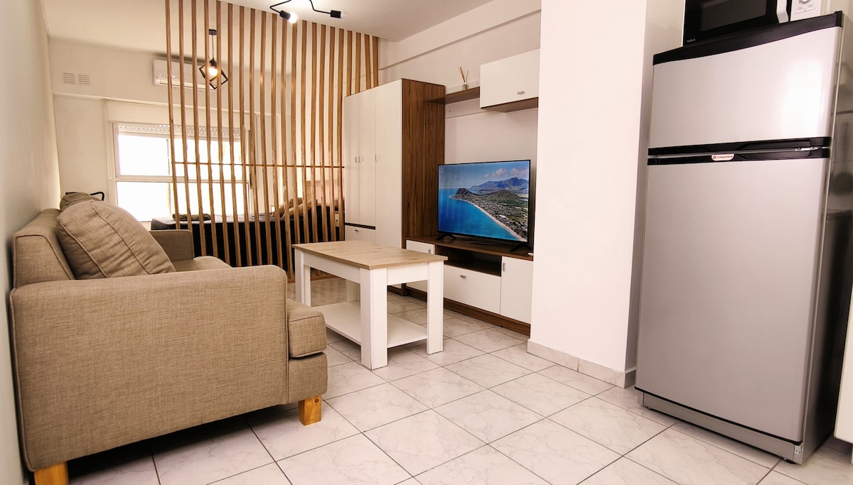 広々とした明るい✅ワンルーム 冷凍庫付き冷蔵庫、オーブン、食器一式を備えたテーブルタイプのバーカウンター付き独立✅キッチン ✅ 大きなバルコニー、テラス 快適な✅ソファと遮光カーテン 快適さとサービス: • ラジエーターと個別ボイラーによる暖房 • 冷暖房 • 高速WiFiとケーブルテレビ フルバスルーム • バスタブとシャワー • ビデ、トイレ、低い蛇口 • リキッドソープ付き ガレージはありませ🚗ん。