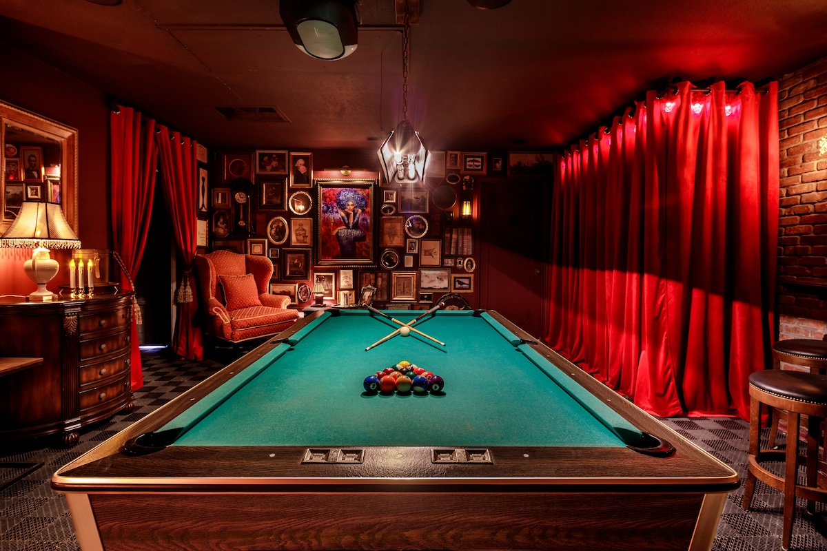 ウェス・アンダーソンにインスパイアされた、カラフルで個性的な砂漠のパーティーが楽しめる、8名様に最適なパーム・ピーチへようこそ。 リゾートスタイルの裏庭にあるプールのそばで、手作りのラウンジチェアで日光浴を楽しみましょう。 大きな塩水プールに飛び込みましょう。 星空の下で温泉を楽しみましょう。 または、暖炉の周りに集まって寒さをしのぎましょう。 ブラックライトの壁画、2.4メートルのビリヤードテーブル、カラオケ、シンプソンズのアーケードなどを備えた、最もユニークなブラックライトゲーム&シアタールームを体験してください。