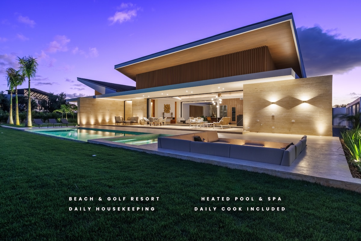 Discover Villa AngelinaBella, NEW construction LUXE villa in exclusive Casa De Campo, Dominican Republic. Enjoy a 5 star resort experience including all day Housekeeping, Cook & Concierge. Relax in this Zen Paradise Oasis near Altos de Chavon, Dye Fore Golf Course. Unwind in the courtyards soothing water elements, 5 En-Suite bedrooms, outdoor soaking tubs, elegant spaces, & private outdoor areas, including a pool, fire pit & hot tub. Includes full access to Marina, Spa, Beaches, Golf & Dining!