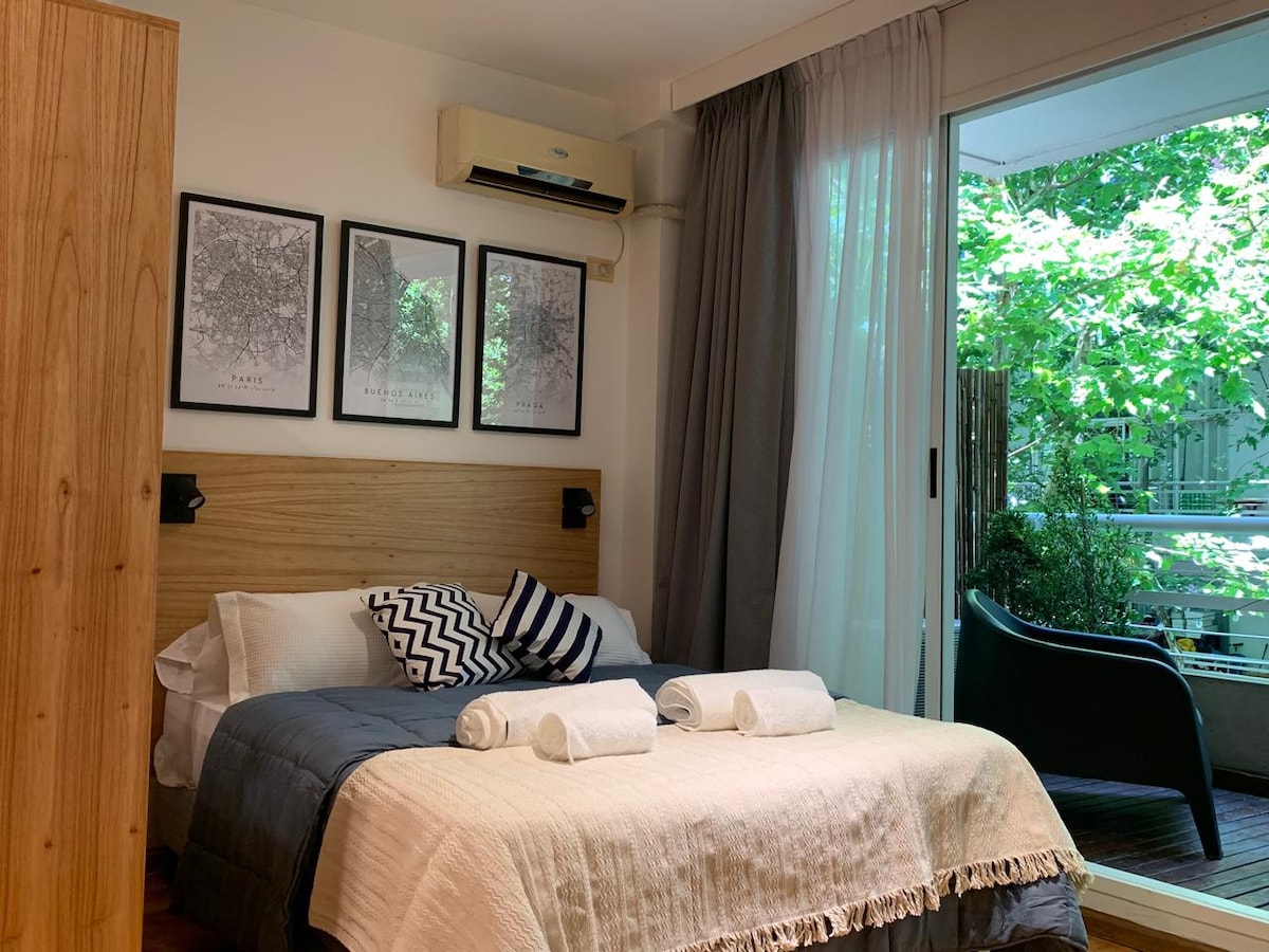 パレルモ・ヌエボの中心部にあるこの静かでエレガントな空間でリラックスしてください。植物園、エコ公園、日本庭園、美術館、プラネタリウム、競馬場、さまざまなグルメなどから徒歩10分以内です。地下鉄「D」線は300メートル先にあり、市内の他の場所への移動に便利です。 アパートには、Wi-Fi接続、NetflixとYoutubeを備えたケーブルテレビ、シーツ、タオル、枕、洗面所とパーソナルケア用品が備わっています。