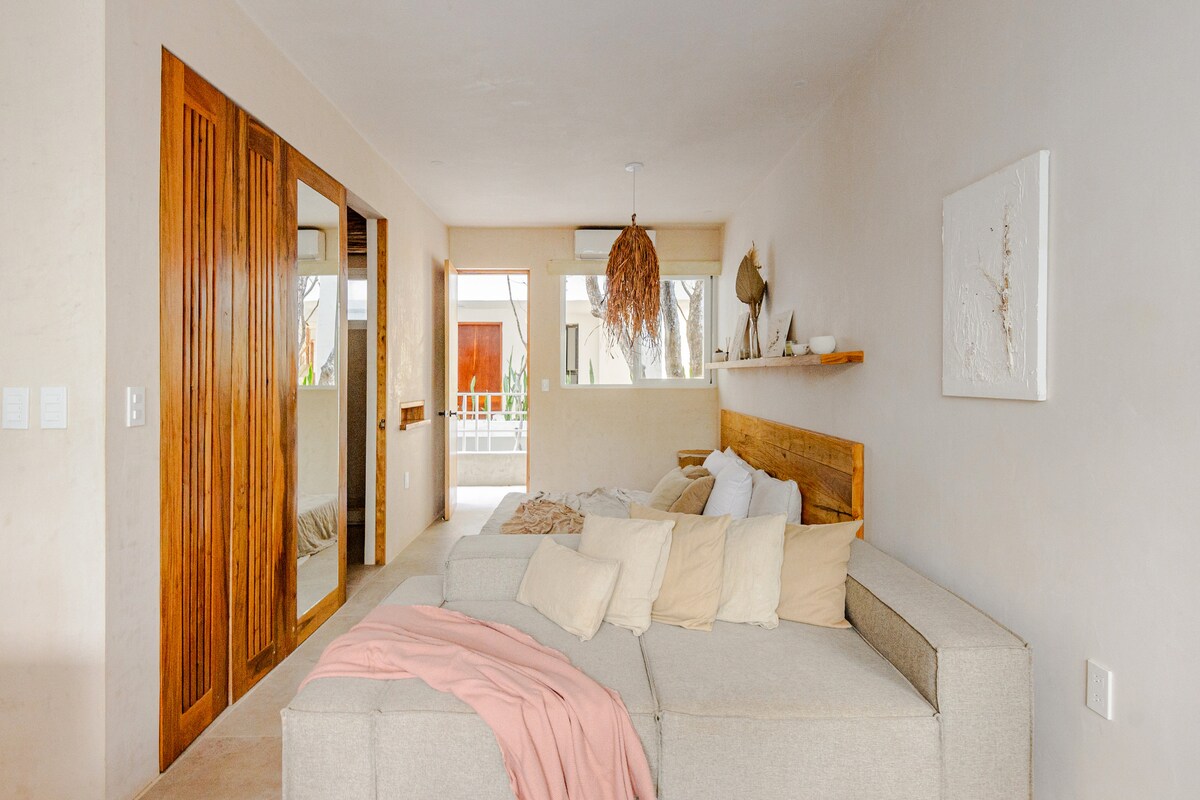 ボヘミアンでエレガントなデザインのこのブティックスタジオでトゥルムのエッセンスをお楽しみください。自然の中でリラックスしたり仕事をしたりしたいカップルや旅行者に最適です。ラ・ベレタの中心部、7番通りから2ブロックの場所に位置するこのスペースは、豪華さ、快適さ、トゥルムのジャングルの魅力を兼ね備えています。緑に囲まれたバルコニーでリラックスしたり、プールを楽しんだり、共用スペースからの良好な接続で仕事をしたりできます。