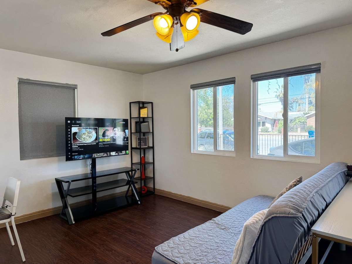 素晴らしいエリアにある快適なプライベートゲストスイートで、ユニットへの専用エントランスがあります。 クイーンサイズベッド付きの1ベッドルームスタジオ。 スタジオには3人目の方のための布団もご用意しております。 キッチンには冷蔵庫、コーヒーメーカー、電子レンジが備わっています。 使い捨てのお皿とコップもご用意しています。 バスルームにはトイレットペーパー、タオル、シャンプー、石けんが備わっています。 アイロンとブロードライヤーをご用意しています。 ゲストエリアは専用のパティオ付きのプライベートです。 裏通りに駐車場1台分をご用意しています。