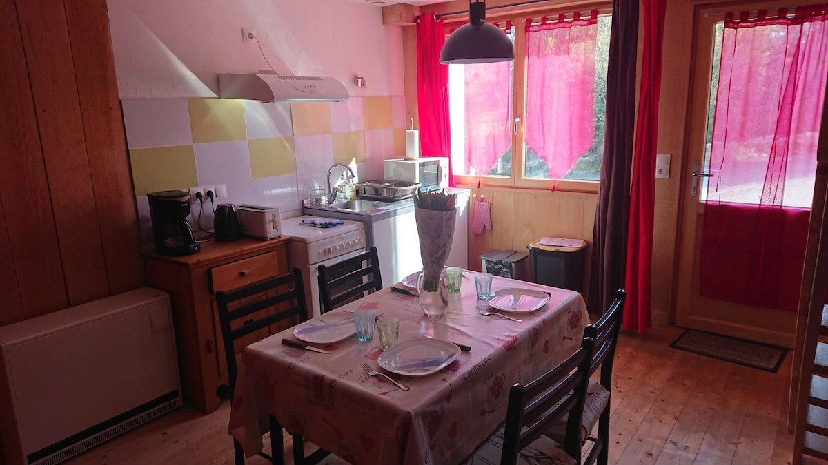 Gîte de 2 personnes de 50m2 au rez-de-chaussée : Le logement sans vis à vis est situé au nord de la maison. L'accès se fait par un petit escalier. Il y a un jardin privatif clôturé au sud de la maison pour les animaux avec barbecue, table et parasol. Accès au grand jardin pour la balançoire. Le gite est situé au coeur de la région des lacs du Jura, à 200 m du port de la Saisse où la rivière d'Ain se jette dans le lac de Vouglans. Maison des anciennes forges des années 1900.