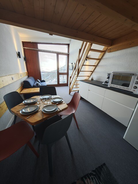 アルク2000にある改装済みワンルーム。 4名用ワンルームアパートメント、29平方メートル、南向きの陽の光が降り注ぐバルコニー付きの6階にあり、アイギュイユ・ルージュに面しています。スキーを履いたままパラディスキ(ゲレンデ425 km)へ。 高級かつ機能的なサービス:4人用のベッド、調理器具付きキッチン、薄型テレビ、Wi-Fi、収納スペース、スキーブーツ用のシューズ乾燥機、装飾。 近くに駐車場があり、アルク2000の中心部から徒歩5分です。 新しいコンシェルジュサービス。