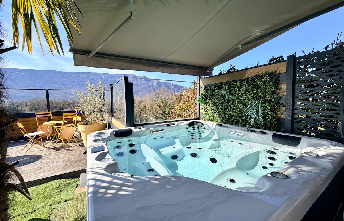 On the South Plateau of Féclaz, come and cocoon yourself at the Cabanes de l'Ange. Its View, ..., its 20 M2 partially covered terrace, its tranquility 5 minutes from the Village Center, its Wellness Area (Jacuzzi-Hammam, Treatments)... will seduce lovers of Nature, Beauty, Silence......Private access to the Spa - 1 hour for 2 => 30 Eur, Cleaning: A deposit of 100 Eur by check or cash is required on arrival for cleaning. Animals accepted after a courtesy exchange.