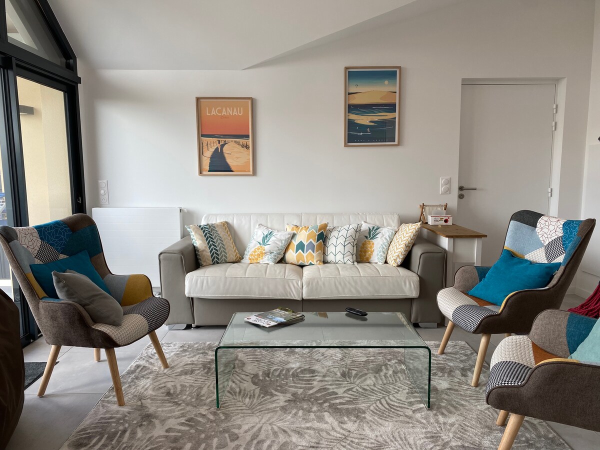 À 100m de la plage, ce logement lumineux de 85m² entièrement refait à neuf par un architecte, est idéalement situé au coeur de Lacanau Océan. Cet appartement décoré avec le plus grand soin possède 2 chambres, 2 salles de bain et dispose de 2 lits et d'un canapé-lit (jusqu'à 5 personnes). maximun Il est idéal pour les familles où les groupes d'amis. Wi-Fi, Netflix, place de parking, ventilateurs.. Tout y est, vous allez vous y sentir comme chez vous !