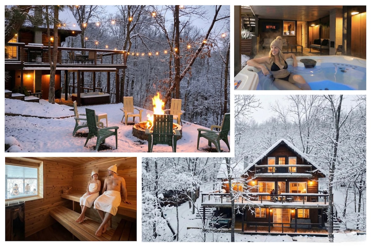 To make your holiday stay even more memorable, the home is decorated for the season with festive accents and a beautifully styled Christmas tree. Escape to this cozy A-frame chalet in Big Bass Lake, perfect for snowy retreats. Warm up in the private barrel sauna, unwind by indoor fireplaces, or enjoy the game room with air hockey, foosball, and 75" Smart TV. Relax by the firepit under twinkle lights, or visit the indoor community pool just 0.4 miles away.