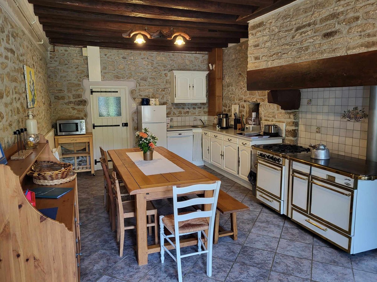 緑豊かで魅力的な環境の2ヘクタールの敷地内に位置するアルフォンシーヌの家は、2つのベッドルーム、リビングルーム、キッチン、バスルームで構成されています。1つ目の寝室には2人用の大きなベッド1台、2つ目の寝室には1人用のベッド2台があります。 バーベキューが楽しめる屋外スペースがあり、歴史の重みを感じさせる場所です。かつて穀物の倉庫だったこの建物は、1940年代に住居に改装されました。