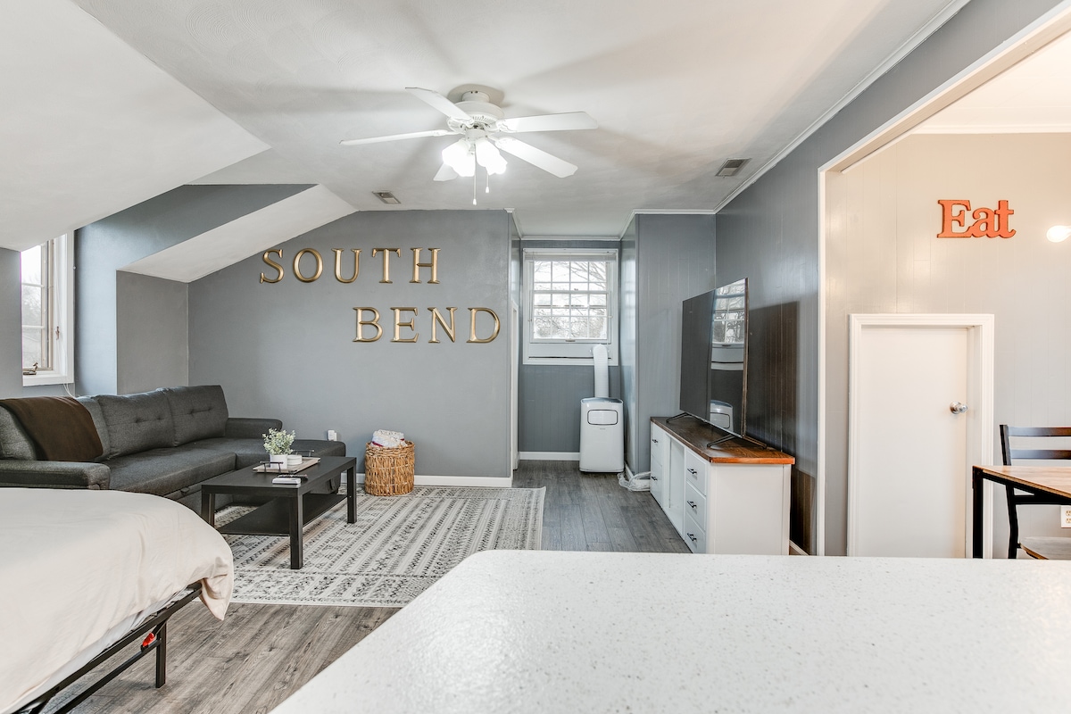 専用の外部ドアの入り口があるスタジオアパートメントスイートにご宿泊ください。ホストは家の残りの部分に住んでいます。裏庭では釣り、カヤック/カヌー、パドルボード、焚き火、グリル、川のそばでリラックスできます。 キングサイズのメモリーフォームベッド、スリーパーソファ、49インチテレビがあります。 広々としたワークスペースデスク、高速Wi-Fi、コーヒーを備え、リモートワークに適しています。クローゼットにはミニ冷蔵庫と電子レンジを備えたミニフードプレップエリアがあり、裏のパティオでグリルを楽しめます。ノートルダムまで車で15分です。