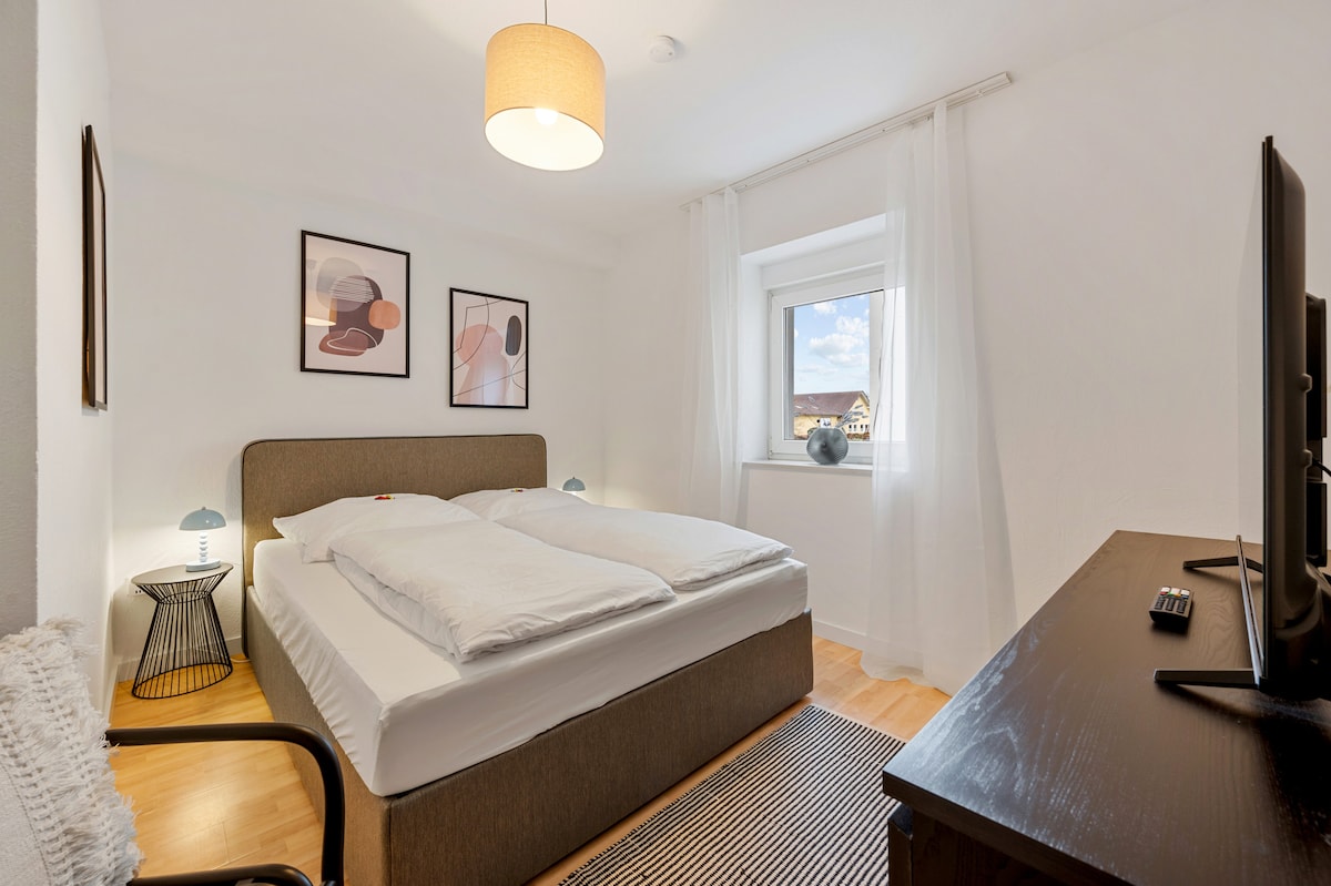 モダンで新しく改装された80平方メートルのアパートメントで、バルコニーとユニークな眺めがあります。アパートはマールバッハ地区にあります。市内中心部まで徒歩15分です。 森の端に位置し、歴史的で活気のある上の町を訪れた後、リラックスするのに最適です。 アパートは完全に高品質でモダンな設備が整っています(バリアフリーではありません)。 寝室、バスルーム、クローゼット、大きな窓のあるオープンなリビング・ダイニングエリアがあります。