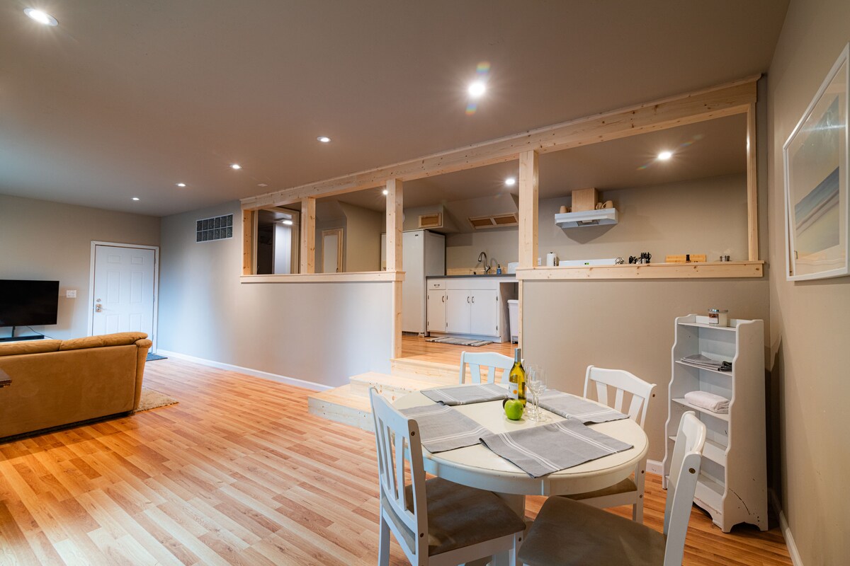 キングサイズベッド、2人用シャワー、広々としたバスタブを備えた快適なフラットで、特別な人と一緒にリラックスできる専用玄関付きのプライベートレジデンスです。 フルサイズの冷蔵庫、レンジ、電子レンジを備えた設備の整ったギャラリースタイルのキッチンがあります。 デッキからはガスグリルが備わったティンバーランドの裏庭が見えます。 リビングルームにはフルサイズのソファベッドと55インチのスマートテレビがあります。 電気自動車の充電は、1泊あたり25ドルの追加料金でご利用いただけます。
